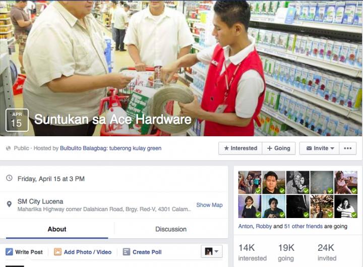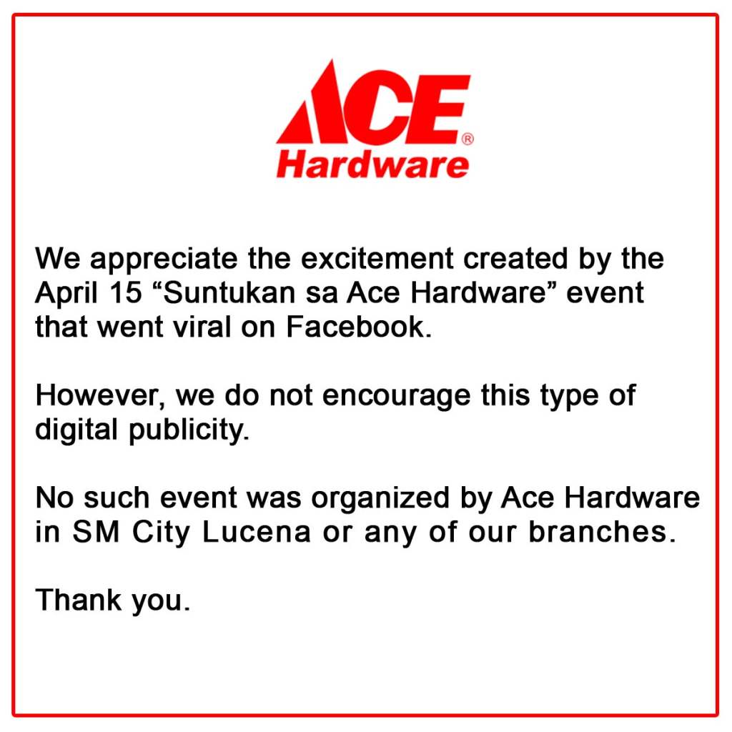 Napunta na sa punto na nagtatanong na ang mga tao sa Facebook page mismo ng ACE Hardware. “Anong oras yung suntukan?” “Magkano yung ticket? Bibili ako ng dalawa.” “Sa Lucena branch lang ba yung event?” Wild. Hindi nagtagal, nagbigay ang kumpanya ng statement na na-appreciate nila yung pananabik ng mga tao dahil sa fake event, pero hindi rin nila hinikayat yung ganoong klaseng publicity.